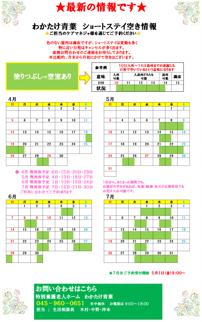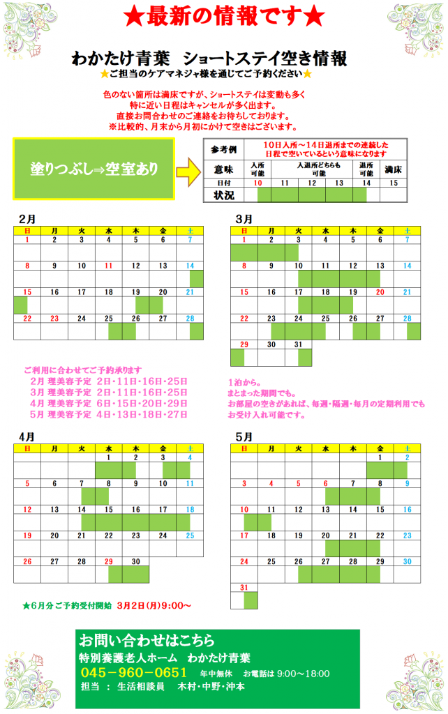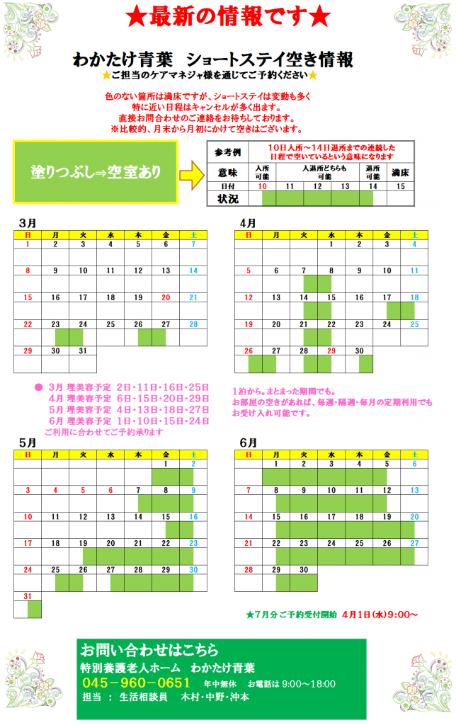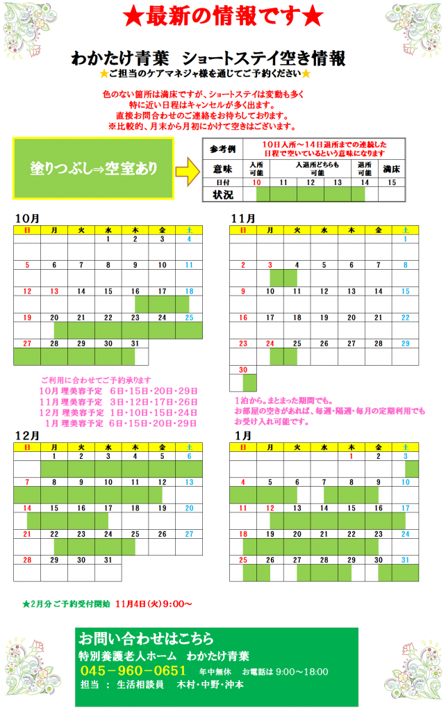 上記日付はページ作成日です。 空き情報は日々更新されております。